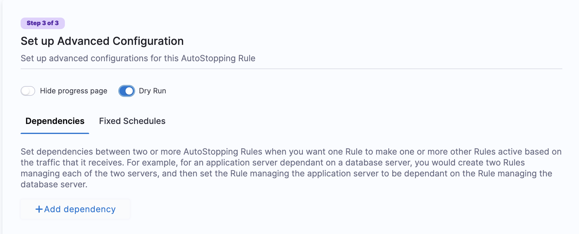 While creating the AutoStopping rule, in the Set up Advanced Configuration step, turn on the Dry Run toggle switch as shown in the screenshot: