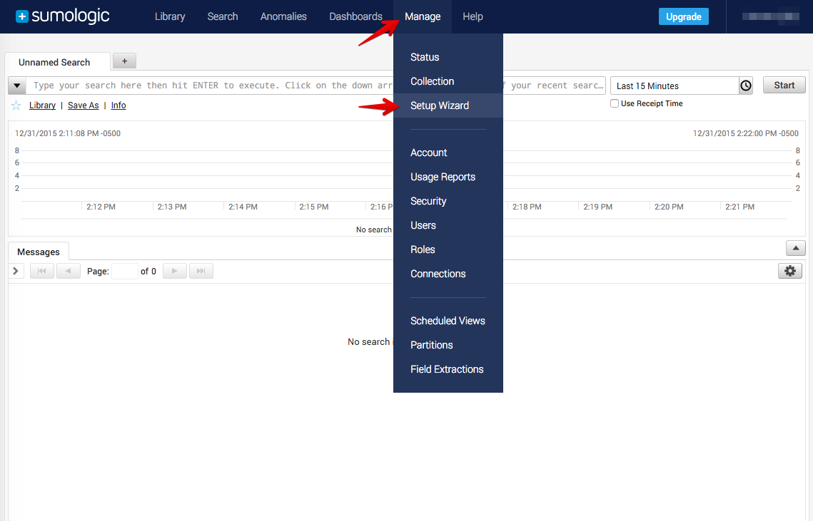 Click Manage and Setup Wizard from the dropdown to set up new streaming data.
