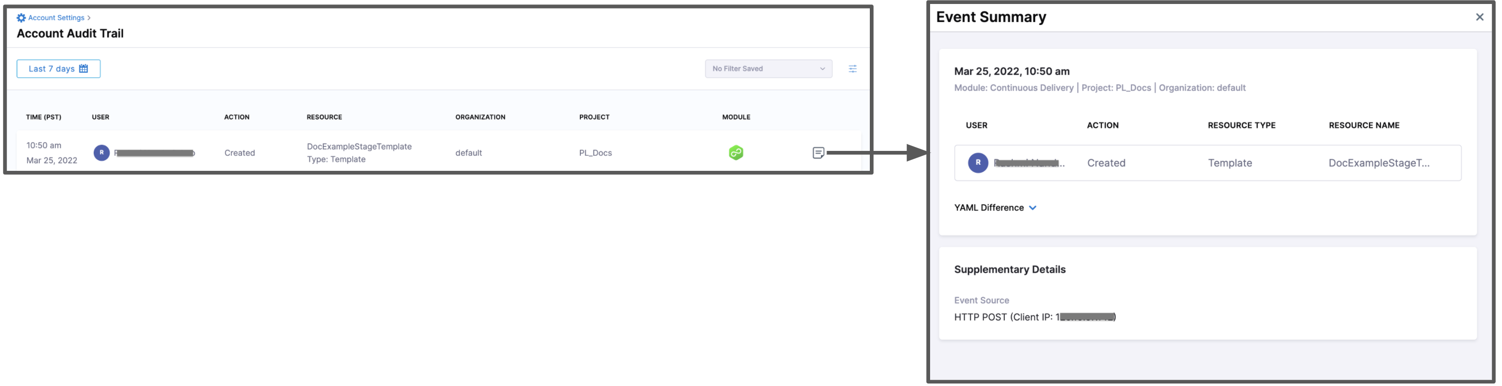The Audit Trail page opens, displaying a record for each event that changed the setup of your Harness account, modules, or Harness entities. By default, Harness shows audit logs for the previous 7 days.
