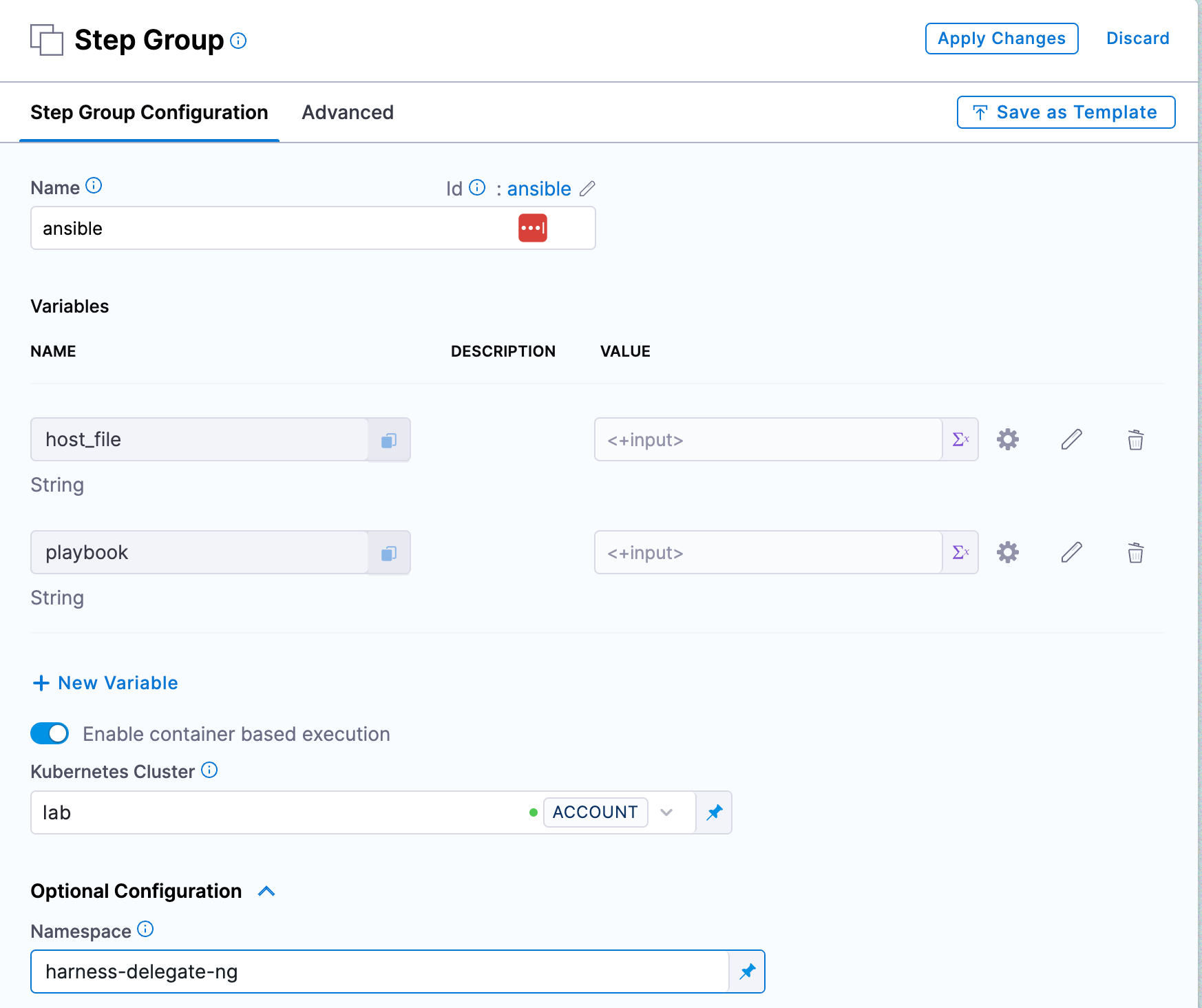 ansible-playbook --private-key=id_rsa -i <+execution.steps.ansible.variables.host_file> -e '<+execution.steps.ansible.variables.extra_vars>' <+execution.steps.ansible.variables.playbook>