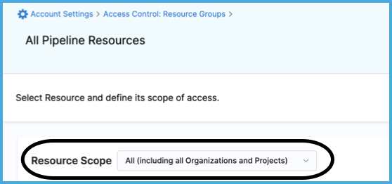 The All Pipeline Resources resource group exists at the account scope and allows access to pipelines, secrets, connectors, delegates, environments, templates, and variables at the account level and in all organizations and projects under the account.