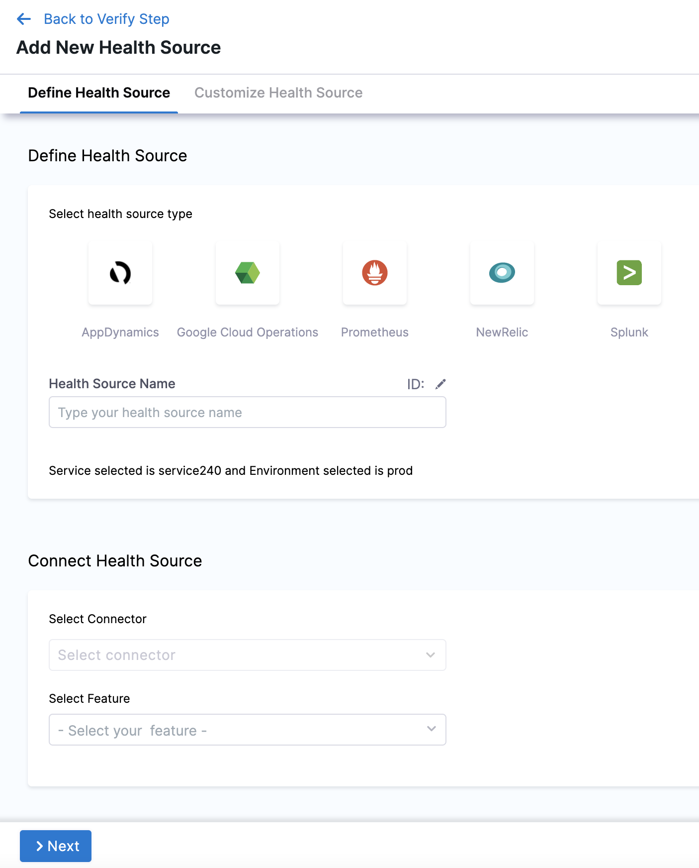 The subsequent settings in Customize Health Source depend on the Health Source Type you selected. You can customize the metrics to map the Harness Service to the monitored environment.